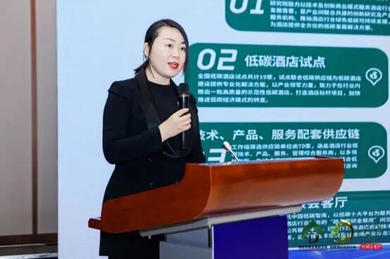 许京生指出,酒店作为高覆盖、高频次的消费场景,响应双碳目标要求,探索酒店行业有序低碳转型路径成为行业要解决的一致性问题,由酒店行业及相关社会组织及研究机构共同成立工作组,以致力解决这一问题,主要方向有,一是制定行业统一推行的低碳酒店评价标准;二是与科研院所及技术单位共同探索基于科技创新与技术集成的综合解决方案;三是结合碳普惠机制,共同探索面向消费者低碳消费需要的有效对话与互动机制。卢景菊 低碳酒店标准工作组副组长、低碳酒店试点行动工作组组长